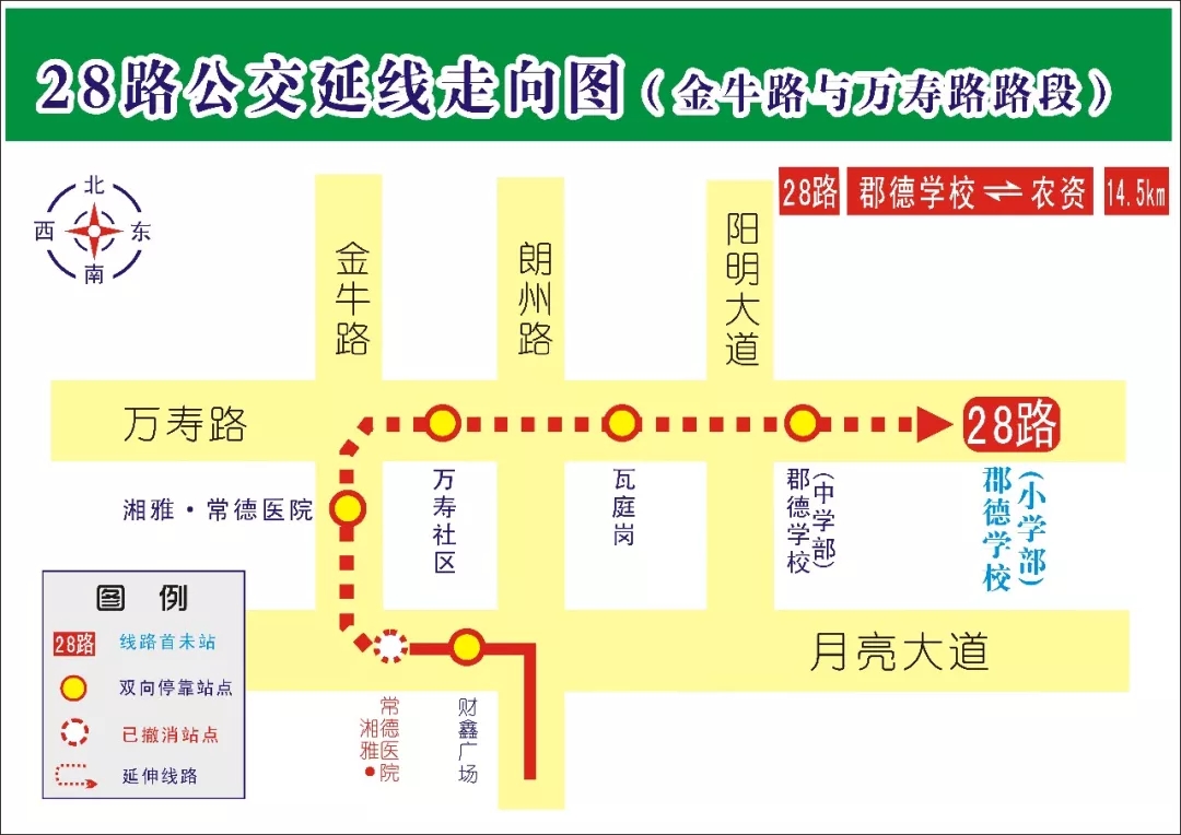 由原終點站湘雅?常德醫(yī)院延伸至長郡·郡德學校(小學部)新增4個站點:萬壽社區(qū)、瓦庭崗、長郡·郡德學校(中學部)、長郡·郡德學校(小學部)