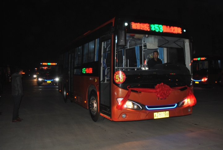 圖為嶄新的53路純電動(dòng)公交車列隊(duì)待發(fā)