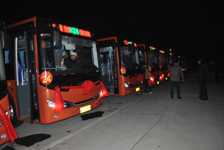 圖為嶄新的24路純電動(dòng)公交車列隊(duì)待發(fā)