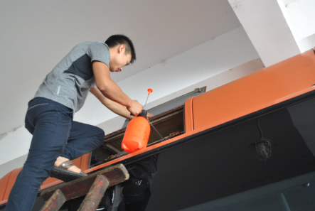 圖為修理人員正在對營運車輛車載燃?xì)怃撈窟M(jìn)行維護(hù)
