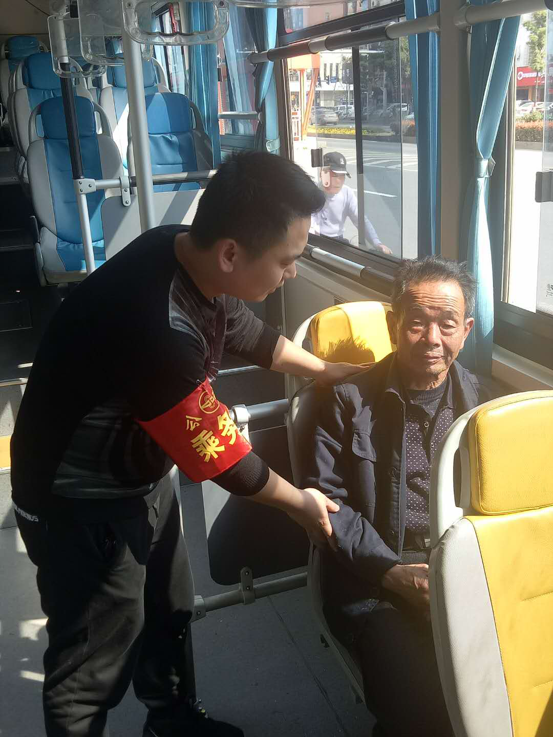 圖為公交公司行政管理人員正攙扶老年乘客入座