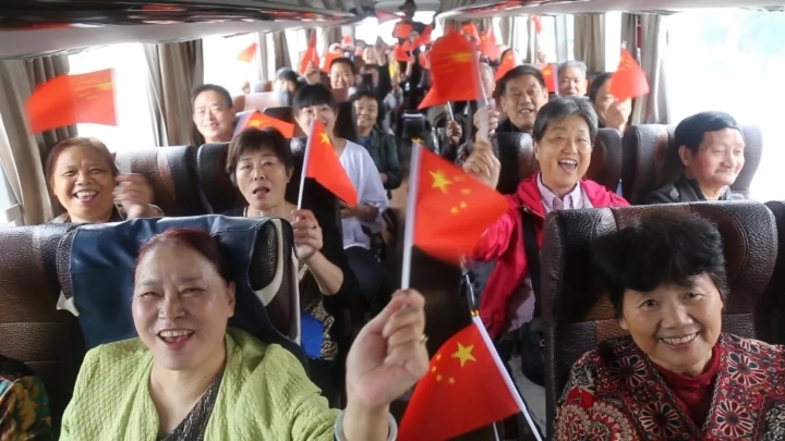 圖為返程大巴上老同志們歌唱《我和我的祖國》