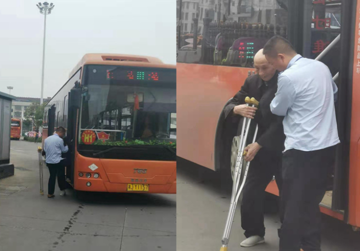 拄拐老人行動(dòng)不便 公交駕駛員扶上背下