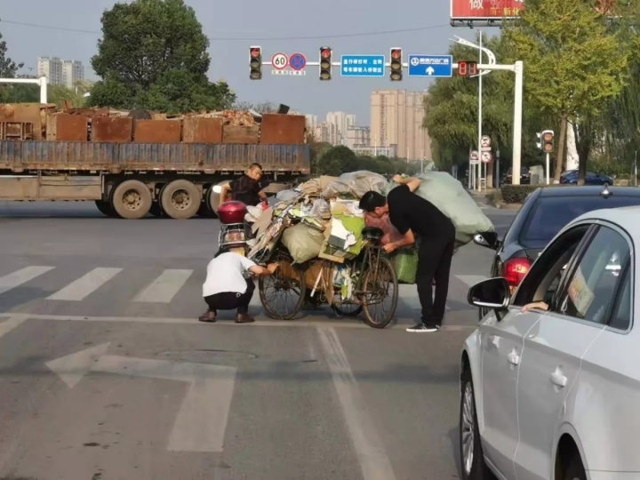 “當(dāng)時(shí)綠燈已經(jīng)亮了,十字路口車輛非常多很危險(xiǎn),我只想盡快幫助老人將三輪車推到安全區(qū)?!标悗煾嫡f到。