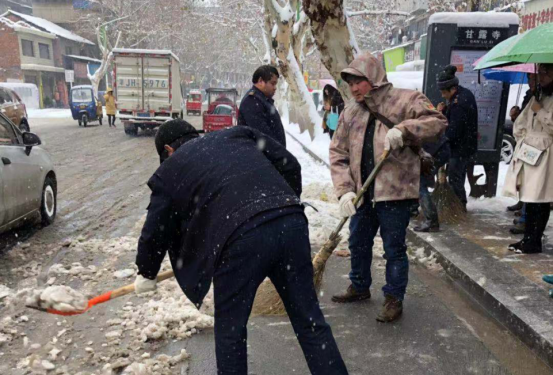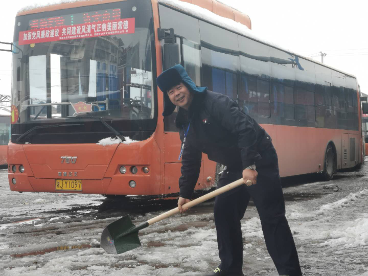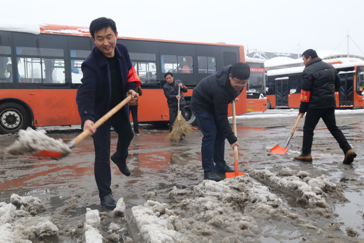 圖為市公交公司班子成員正帶領(lǐng)干部職工開(kāi)展鏟雪除冰工作