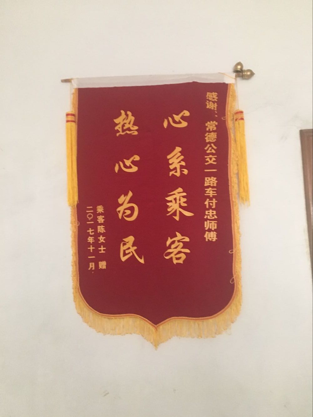 11月24日一大早,女乘客的兒子來到公司客服中心,親手為好心駕駛員付忠送來了感謝錦旗,并再三向付師傅表達了感謝之情。