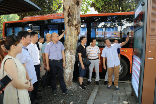 圖為調(diào)研團一行在觀摩智能電子站牌