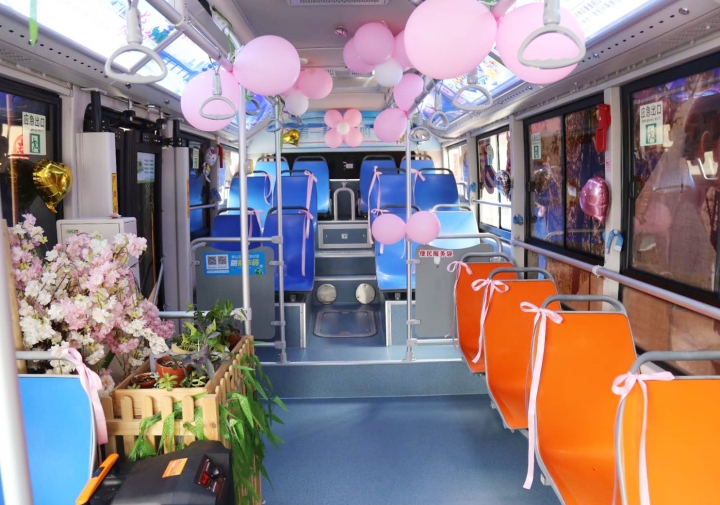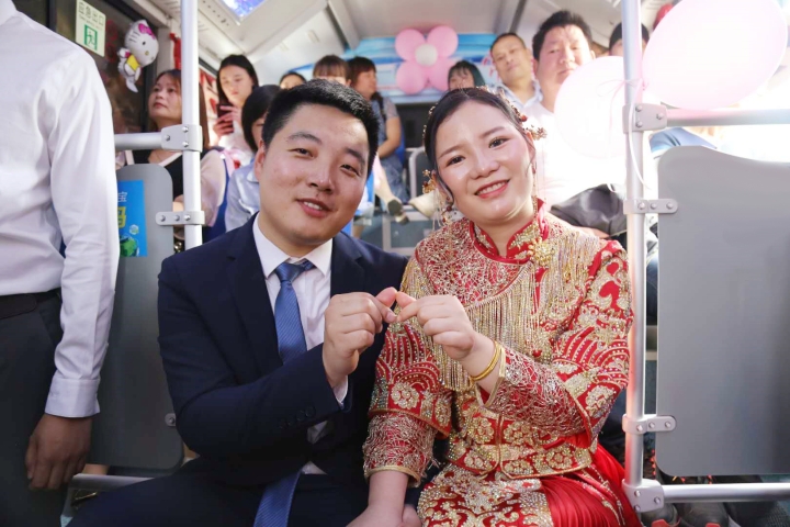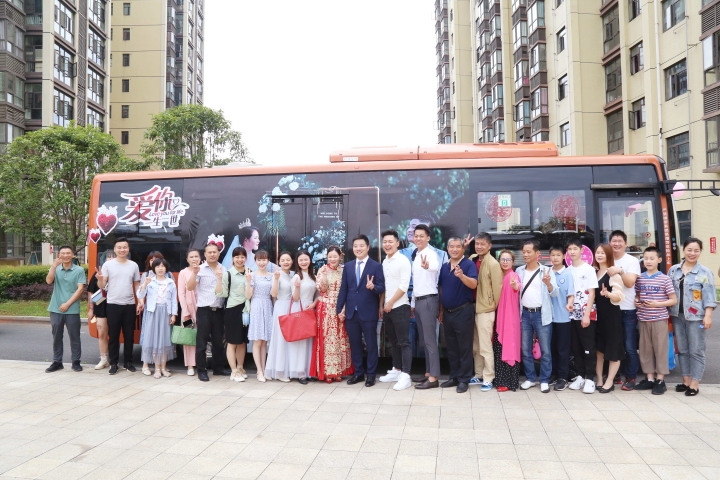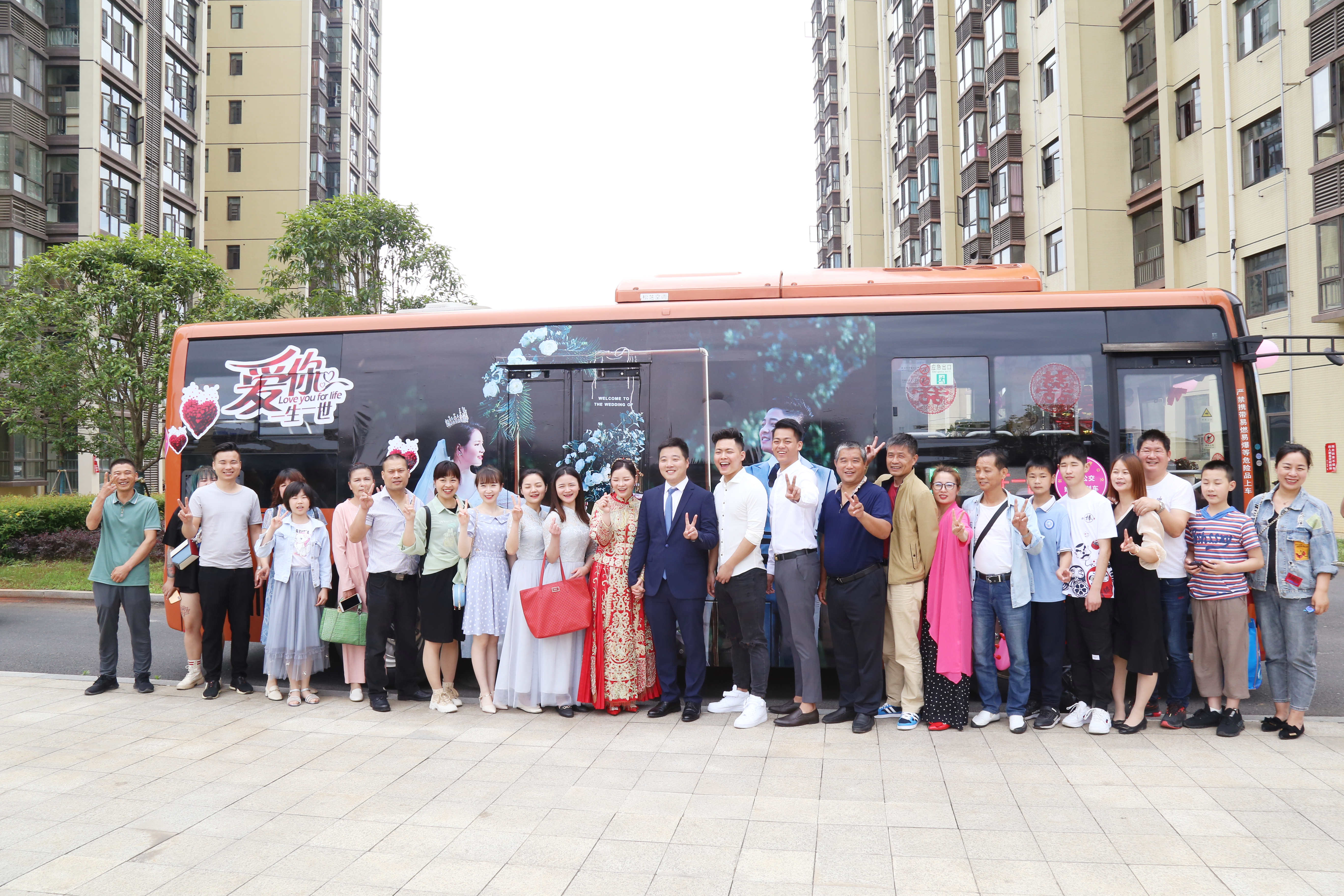 5月22日上午10時(shí),一輛車身張貼著婚禮海報(bào),車內(nèi)懸掛著彩色拉花和氣球,車載顯示屏播放著“520一生一世”的公交車緩緩駛?cè)虢?jīng)開區(qū)瑤湖苑小區(qū)。隨后車廂內(nèi)響起了浪漫的音樂,一對身穿中式婚禮服的美麗新娘與新郎,在親朋好友的簇?fù)硐戮彶降侨搿皭邸钡能噹?/span>