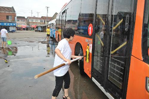 (圖為行管黨員到分公司帶隊協(xié)助司乘人員清洗車輛)