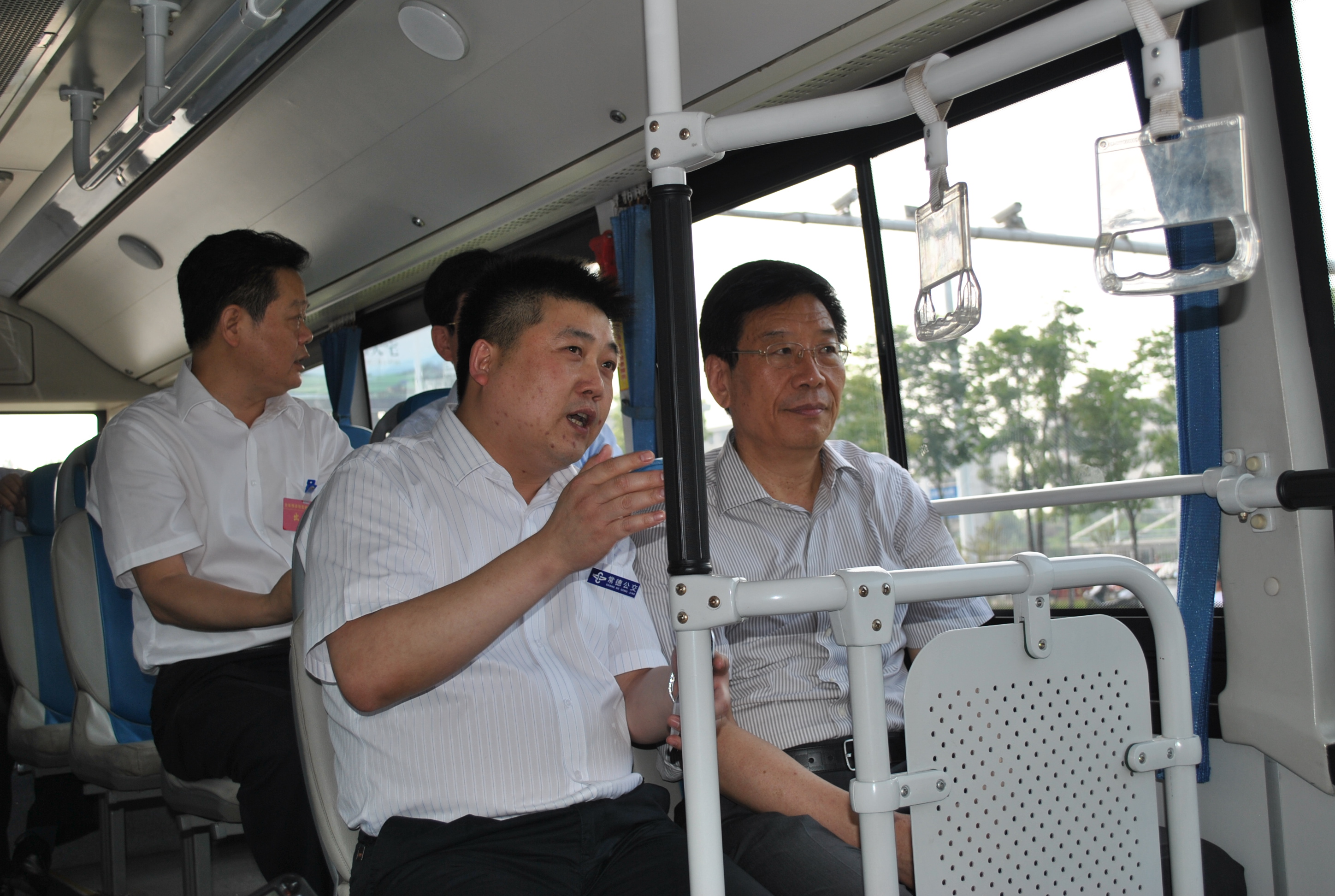 圖為湖南省委書記徐守盛(右一)在快速公交車廂聽取公司董事長周峰關(guān)于快速公交運行情況匯報